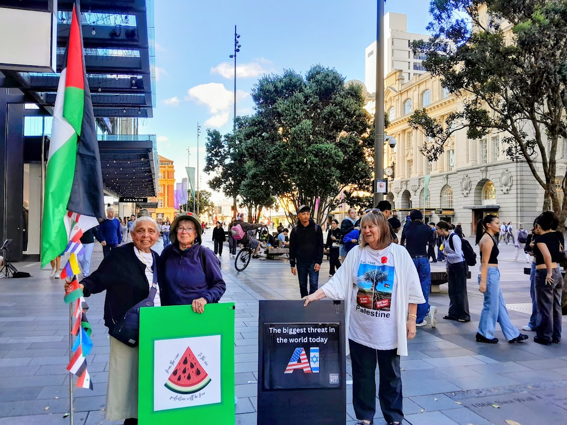 Our member and co-chair Patsy George has been touring Australia and New Zealand. Along the way, she has stood and marched in solidarity for world peace and for a Free Palestine with activists in those two countries. Here are some photos from her solidarity actions on her trip.