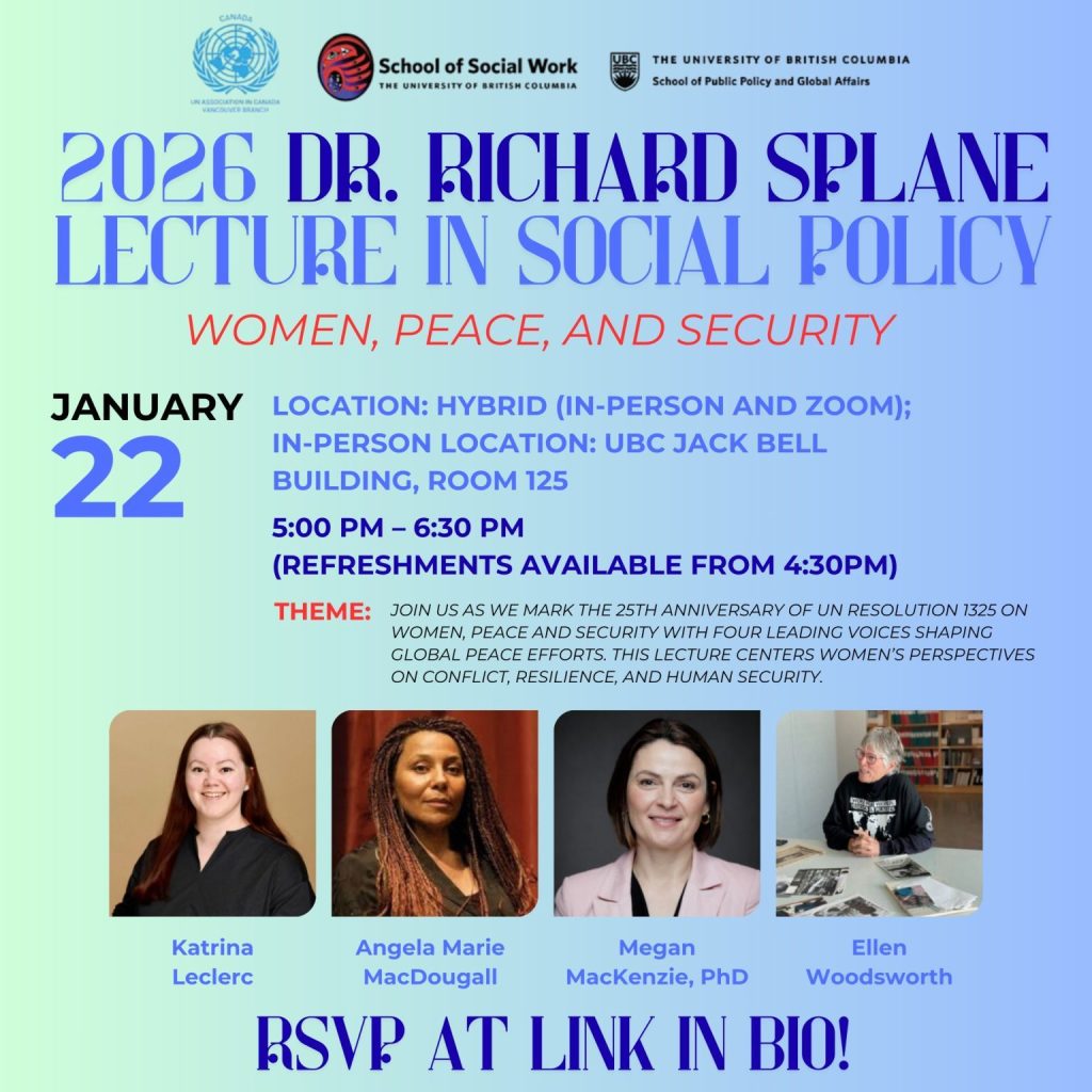 Our co-chairs, Patsy and Ellen participated in the Annual Splane Lecture in Social Policy to mark the 25th anniversary of United Nations’ Resolution 1325 on Women, Peace and Security. Patsy gave opening remarks about Richard Splane the prominent social worker in British Columbia for whom the annual lecture is named. Ellen discussed how militarism and military spending is threatening the Women, Peace & Security agenda and how people can get involved in grassroots groups and community work to centre demilitarization, peace and social justice. Ellen’s presentation was based on her recently co-authored article “Canada’s Rising Military Spending Undermines Women, Peace and Security” published in the WPSN-Canada report.