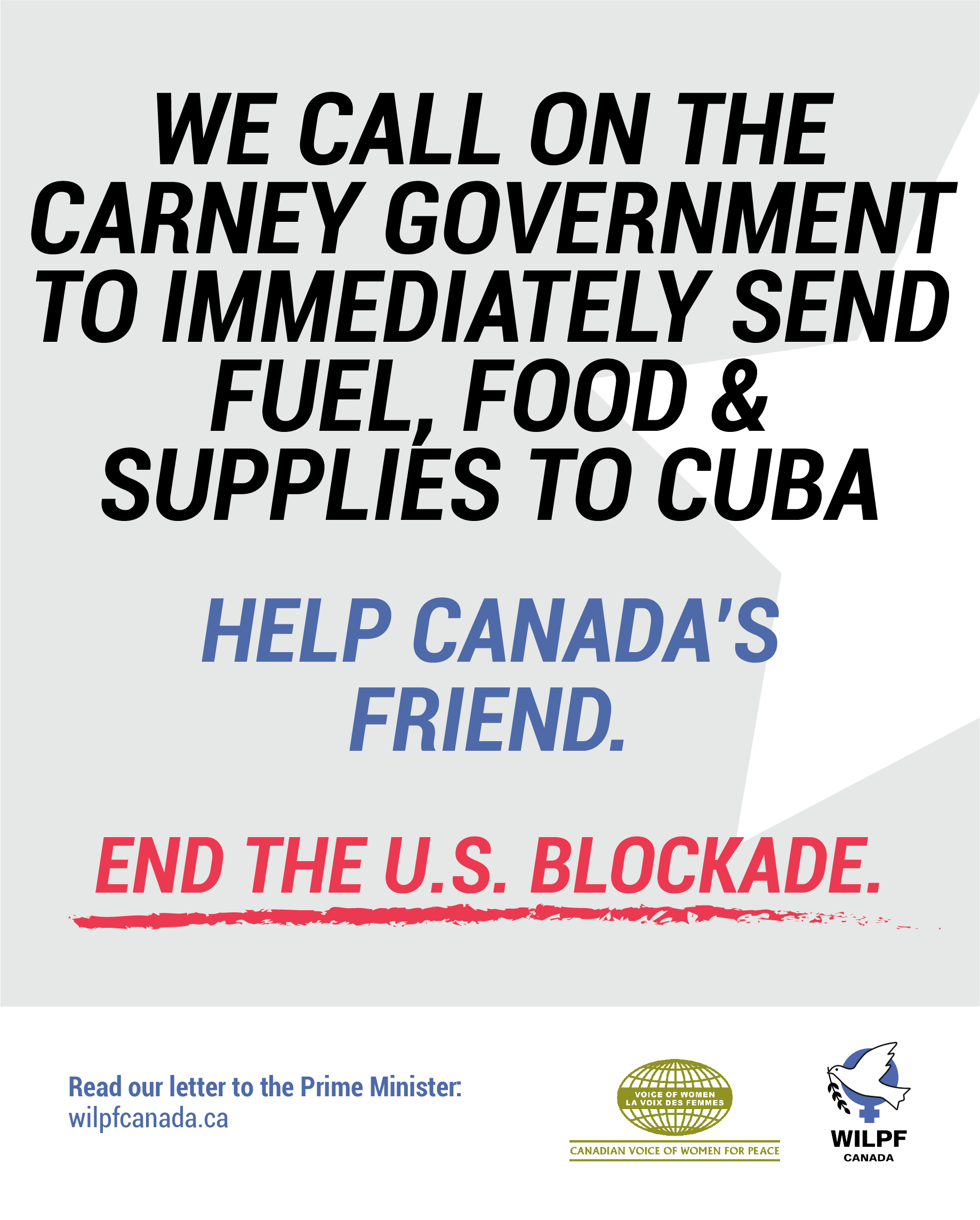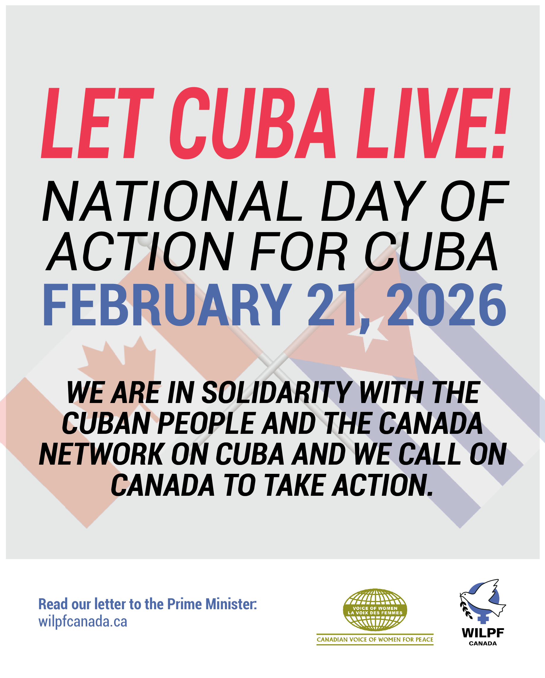 In solidarity with the Canada Network on Cuba and the  National Day of Action for Cuba on February 21, 2026, WILPF-Canada has partnered with the Canadian Voice of Women for Peace in sending a letter to Prime Minister Mark Carney and Minister of Foreign Affairs Anita Anand to call on them to urgently send fuel and supplies to Cuba. We are also participating in rallies across the country. We denounce the Trump administration’s cruel and illegal blockade against Cuba. Canada is a friend of Cuba and should provide aid to the island as soon as possible and condemn the U.S.’s sanctions and siege.