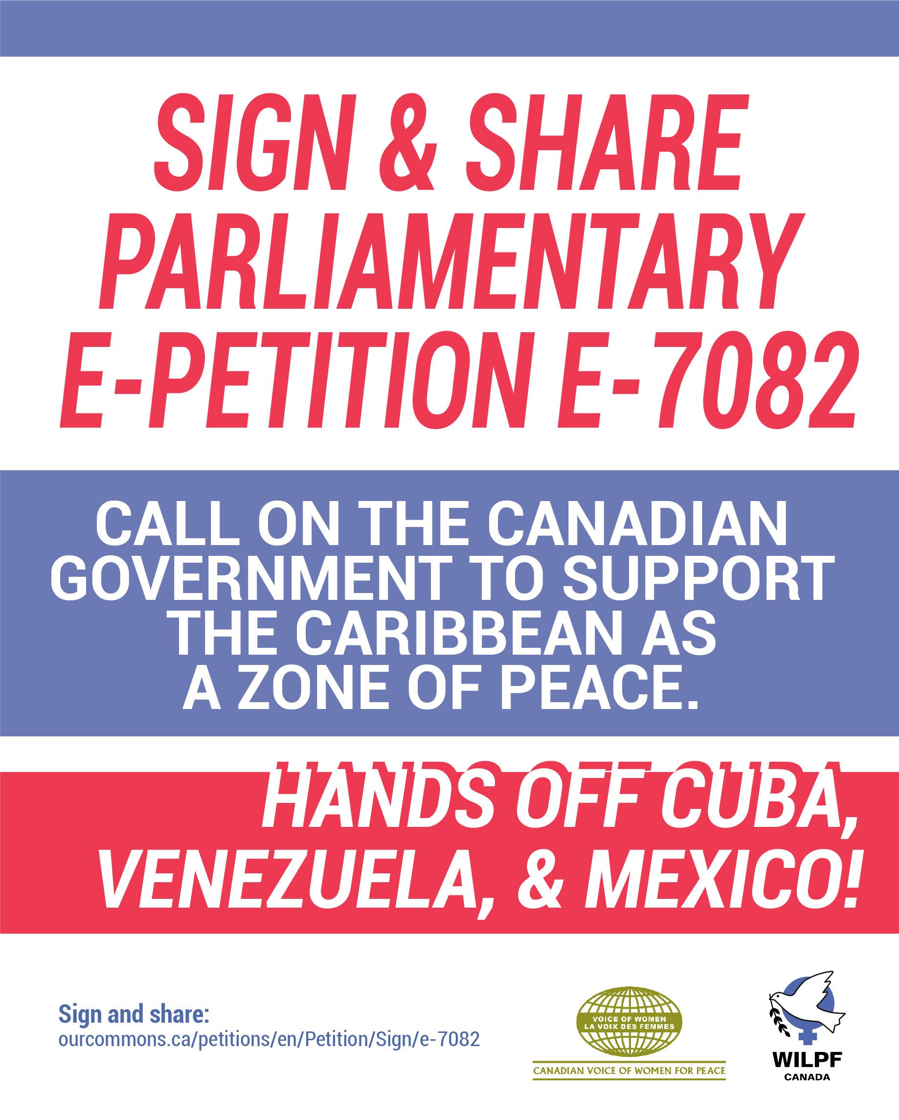 Please sign the Parliamentary e-petition before April 20, 2026 to call on the Government of Canada to publicly condemn U.S. aggressions as violations of international law; refuse to participate in, support, or legitimize military, economic, or political aggressions against Venezuela and other countries; reaffirm and actively support the Caribbean as a Zone of Peace, free from external military intervention; and actively reject any and all interventions and military aggressions against Cuba, Colombia and Mexico. Sign here.
